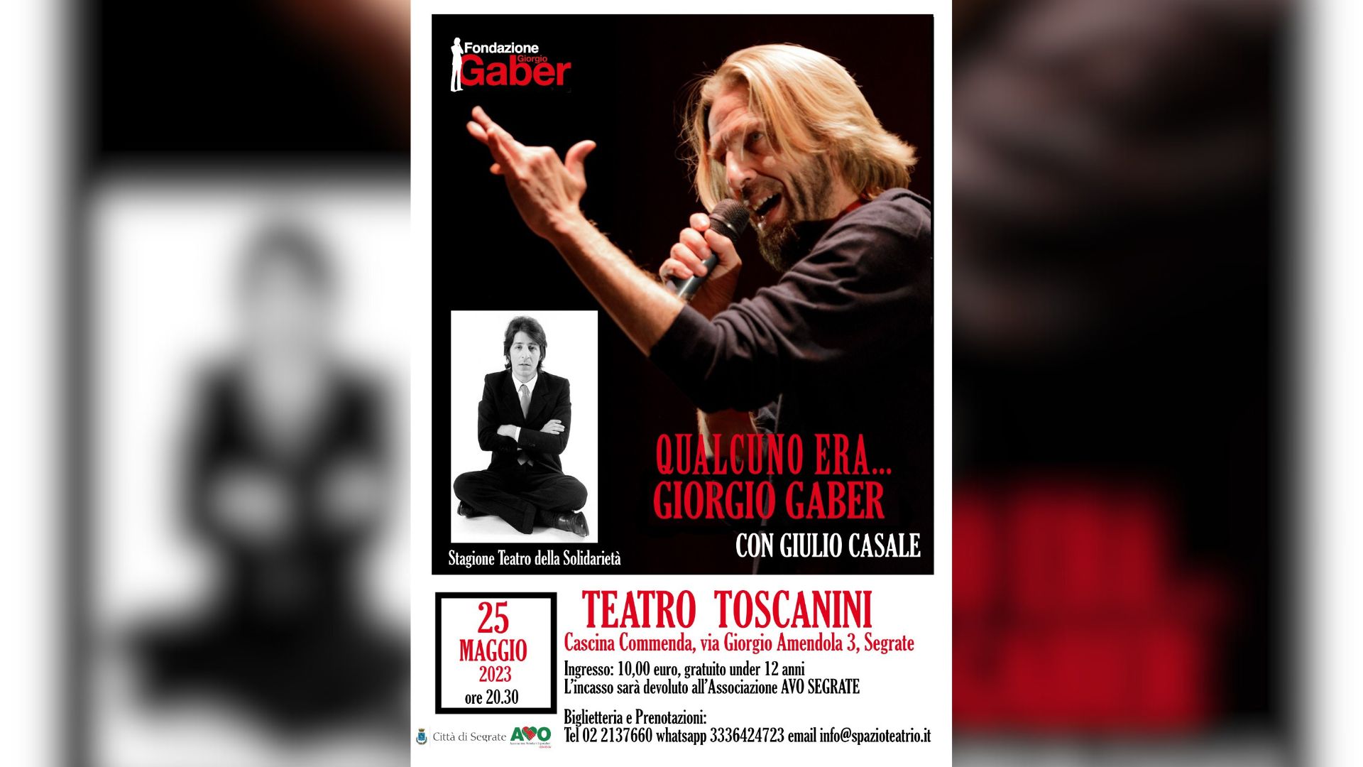 Lo spettacolo proposto dalla Fondazione Gaber in esclusiva per la città di Segrate proporrà, con Giulio Casale, vari momenti del Teatro-Canzone di Gaber e Luporini accompagnati da alcuni rari documenti filmati di grande interesse storico e artistico.