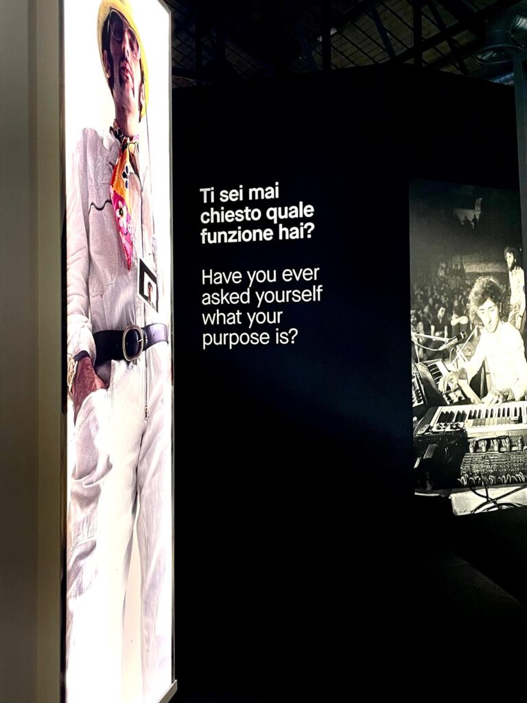 Una fitta scrivania di libri: Gurdjieff, Guenon, la filocalia, il Tantra. La tuta bianca multitasche del 1972. Il tappeto persiano del concerto di Baghdad. Il ritratto di Giuni Russo, Sgalambro e Gilgamesh. I manifesti dei concertoni anni ’80. Una parete di riviste – da «Rockerilla» a «XL», da «Ciao 2001» a «Cioè». All’ingresso, alla prima rampa di scale, un aforisma, più che un ritornello, da Inneres Auge: «La linea orizzontale ci spinge verso la materia; quella verticale verso li spirito». E una volta entrati, non più un’affermazione ma una domanda, inquieta ma necessaria, che resta dentro, presenza scomoda in tutto il cammino nella mostra: «Ti sei mai questo quale funzione hai?».